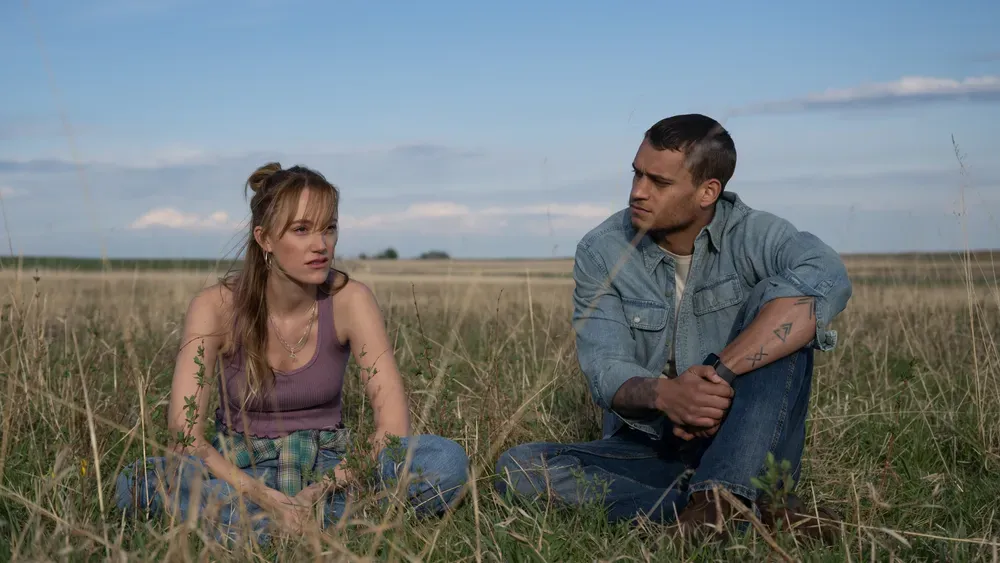 This image released by Universal Pictures shows Maika Monroe, left, and Tyriq Withers in a scene from "Reminders of Him." Photo Credit: Michelle Faye/Universal Pictures via AP