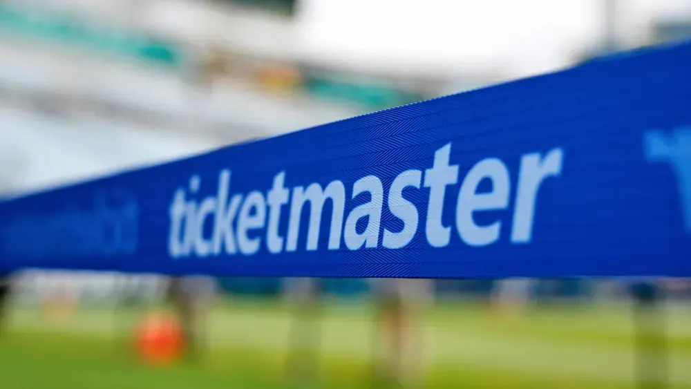 The Ticketmaster logo is seen along the sideline of the field before an NFL football game, Sept. 15, 2024, in Jacksonville, Fla. Photo Credit: AP Photo/Phelan M. Ebenhack, File